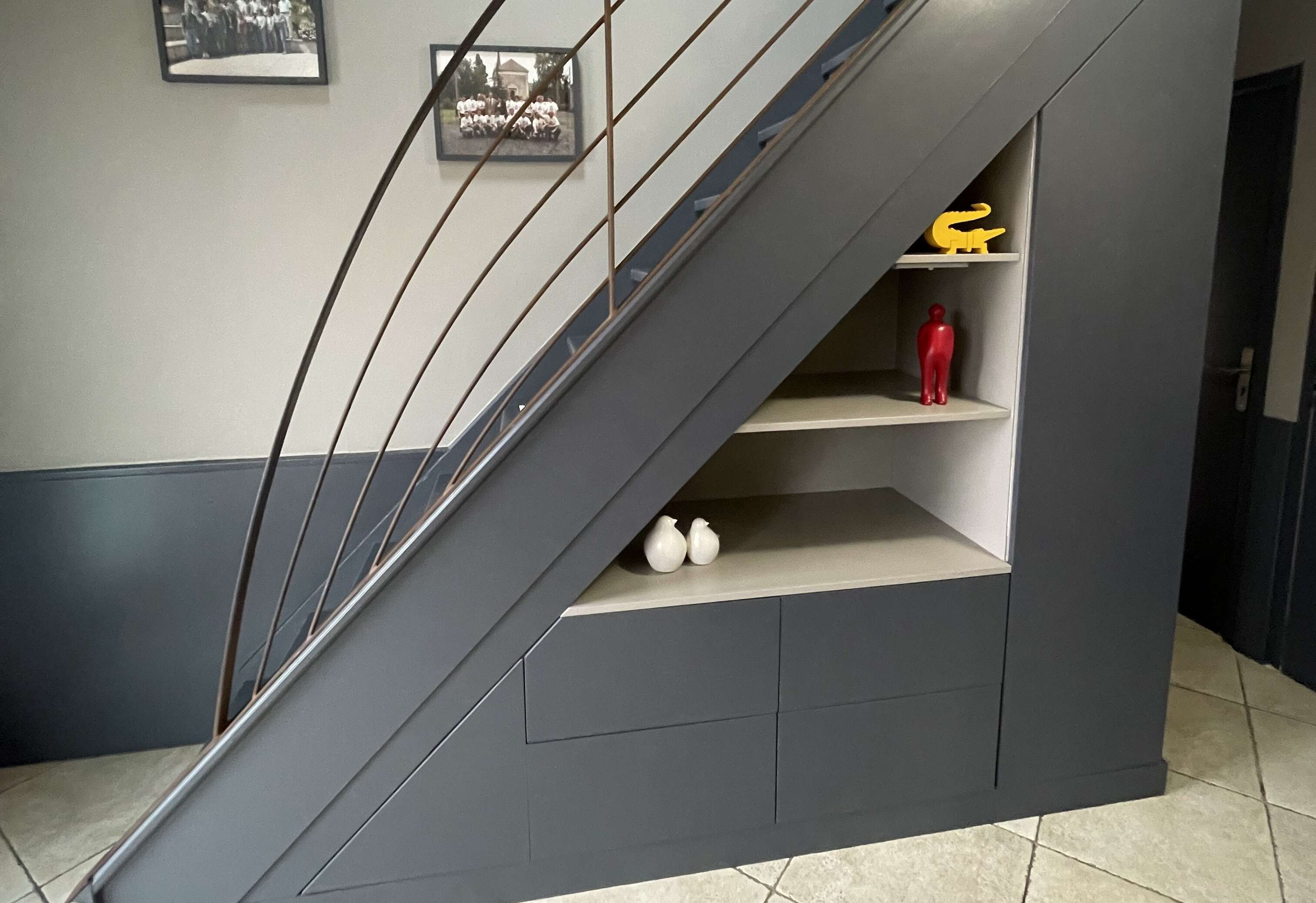Nous réalisons des meubles sous escalier, des placards encastrés ou encore des espaces de rangement discrets mais efficaces.